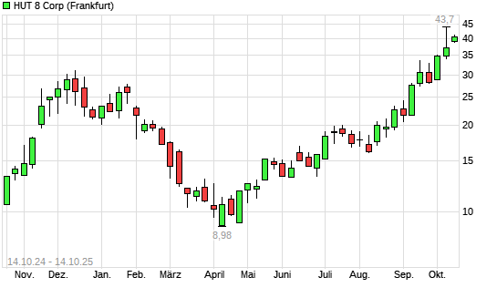 Mit dem Anstieg auf 41,30 EUR hat die Hut 8 Mining-Aktie (ISIN US44812J1043) am 13.10.2025 ein neues 3-Jahres-Hoch erreicht und damit den Kurs vom 09.10.2025 eingestellt.