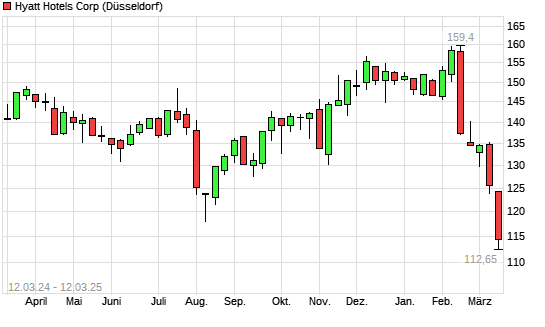 Mit dem Rücksetzer auf 118,75 EUR hat die Hyatt Hotels A-Aktie (ISIN US4485791028) am 11.03.2025 ein neues 12-Monats-Tief erreicht und damit den Kurs vom 08.08.2024 eingestellt.