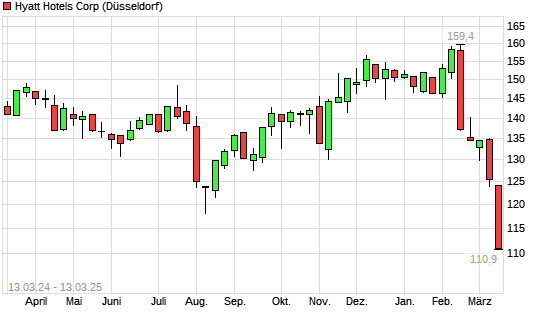 Mit dem Rücksetzer auf 116,60 EUR hat die Hyatt Hotels A-Aktie (ISIN US4485791028) am 12.03.2025 ein neues 12-Monats-Tief erreicht und damit den Kurs vom 11.03.2025 eingestellt.
