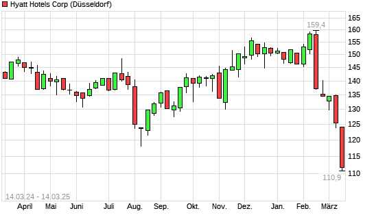 Mit dem Rücksetzer auf 113,80 EUR hat die Hyatt Hotels A-Aktie (ISIN US4485791028) am 13.03.2025 ein neues 12-Monats-Tief erreicht und damit den Kurs vom 12.03.2025 eingestellt.