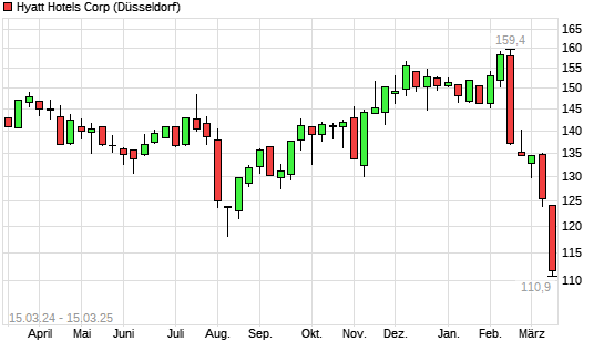 Mit dem Rücksetzer auf 112,00 EUR hat die Hyatt Hotels A-Aktie (ISIN US4485791028) am 14.03.2025 ein neues 12-Monats-Tief erreicht und damit den Kurs vom 13.03.2025 eingestellt.