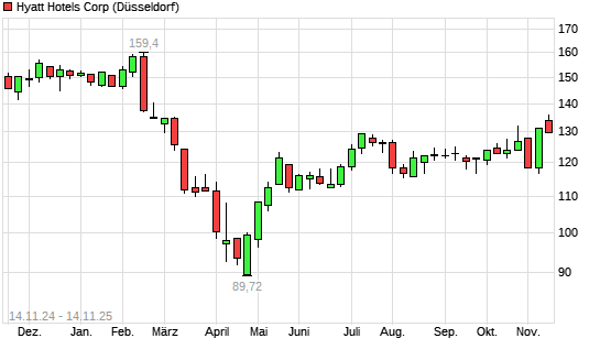 Mit dem Anstieg auf 135,20 EUR hat die Hyatt Hotels A-Aktie (ISIN US4485791028) am 13.11.2025 ein neues 6-Monats-Hoch erreicht und damit den Kurs vom 11.11.2025 eingestellt.