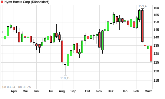Mit dem Rücksetzer auf 126,25 EUR hat die Hyatt Hotels A-Aktie (ISIN US4485791028) am 07.03.2025 ein neues 6-Monats-Tief erreicht und damit den Kurs vom 06.03.2025 eingestellt.