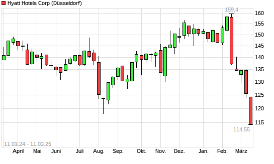 Mit dem Rücksetzer auf 124,70 EUR hat die Hyatt Hotels A-Aktie (ISIN US4485791028) am 10.03.2025 ein neues 6-Monats-Tief erreicht und damit den Kurs vom 07.03.2025 eingestellt.