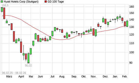 Mit dem Anstieg auf 136,05 EUR hat die Hyatt Hotels A-Aktie am 05.02.2026 die 100-Tage-Linie nach oben gekreuzt.