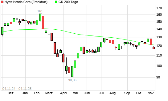 Mit dem Rücksetzer auf 119,90 EUR hat die Hyatt Hotels A-Aktie am 03.11.2025 die 200-Tage-Linie nach unten gekreuzt.