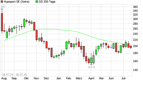 Mit dem Rücksetzer auf 196,00 EUR hat die Hypoport-Aktie am 25.07.2025 die 200-Tage-Linie nach unten gekreuzt.