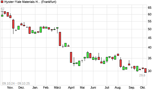 Mit dem Rücksetzer auf 29,60 EUR hat die Hyster-Yale Materials Handling-Aktie (ISIN US4491721050) am 08.10.2025 ein neues 12-Monats-Tief erreicht und damit den Kurs vom 17.09.2025 eingestellt.