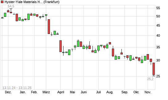 Mit dem Rücksetzer auf 26,40 EUR hat die Hyster-Yale Materials Handling-Aktie (ISIN US4491721050) am 12.11.2025 ein neues 12-Monats-Tief erreicht und damit den Kurs vom 11.11.2025 eingestellt.