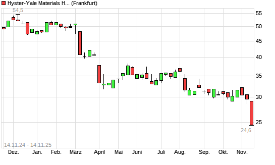 Mit dem Rücksetzer auf 25,40 EUR hat die Hyster-Yale Materials Handling-Aktie (ISIN US4491721050) am 13.11.2025 ein neues 12-Monats-Tief erreicht und damit den Kurs vom 12.11.2025 eingestellt.
