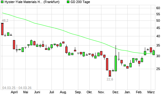 Mit dem Anstieg auf 33,00 EUR hat die Hyster-Yale Materials Handling-Aktie am 03.03.2026 die 200-Tage-Linie nach oben gekreuzt.Die Hyster-Yale Materials Handling-Aktie befand sich seit ...weiterlesen