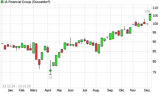 Mit dem Anstieg auf 107,00 EUR hat die IA Financial-Aktie (ISIN CA45075E1043) am 12.12.2025 ein neues All-Time-High erreicht und damit den Kurs vom 11.12.2025 eingestellt.