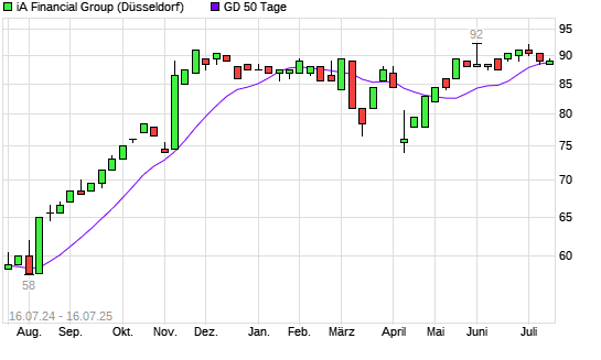 Mit dem Anstieg auf 90,00 EUR hat die IA Financial-Aktie am 15.07.2025 die 50-Tage-Linie nach oben gekreuzt.Die IA Financial-Aktie befindet sich seit dem 23.04.2025 im langfristigen Aufwärtstrend ...weiterlesen