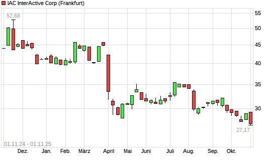 Mit dem Rücksetzer auf 27,34 EUR hat die IAC InterActiveCorp-Aktie (ISIN US44891N2080) am 31.10.2025 ein neues 5-Jahres-Tief erreicht und damit den Kurs vom 30.10.2025 eingestellt.