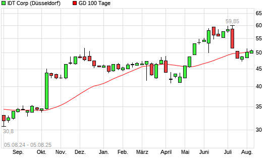 Mit dem Rücksetzer auf 49,78 EUR hat die IDT-Aktie am 04.08.2025 die 100-Tage-Linie nach unten gekreuzt.