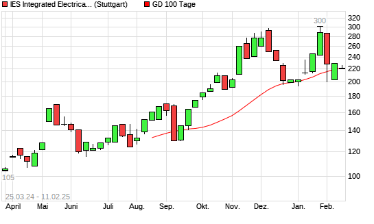 Mit dem Rücksetzer auf 220,00 EUR hat die IES Holdings-Aktie am 10.02.2025 die 100-Tage-Linie nach unten gekreuzt.