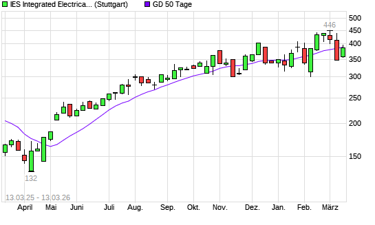 Mit dem Rücksetzer auf 376,00 EUR hat die IES Integrated Electrical Services-Aktie am 12.03.2026 die 50-Tage-Linie nach unten gekreuzt.