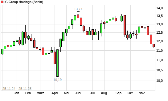 Mit dem Rücksetzer auf 11,76 EUR hat die IG GROUP HOLDINGS-Aktie (ISIN GB00B06QFB75) am 24.11.2025 ein neues 6-Monats-Tief erreicht und damit den Kurs vom 21.11.2025 eingestellt.
