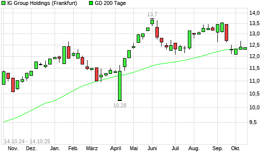 Mit dem Rücksetzer auf 12,30 EUR hat die IG GROUP HOLDINGS-Aktie am 13.10.2025 die 200-Tage-Linie nach unten gekreuzt.