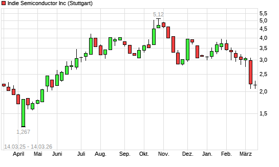 Mit dem Rücksetzer auf 2,01 EUR hat die INDIE SEMICON. A-Aktie (ISIN US45569U1016) am 13.03.2026 ein neues 6-Monats-Tief erreicht und damit den Kurs vom 06.03.2026 eingestellt.