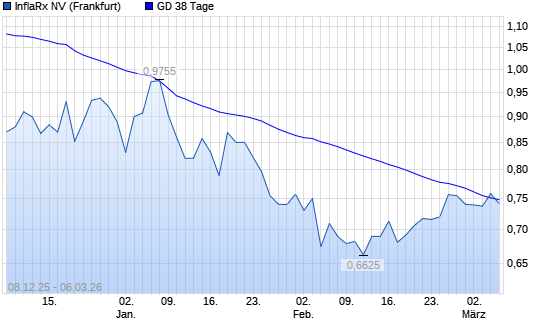 Mit dem Rücksetzer auf 0,74 EUR hat die INFLARX N.V.-Aktie am 05.03.2026 die 38-Tage-Linie nach unten gekreuzt.Die INFLARX N.V.-Aktie befindet sich seit dem 09.01.2026 ...weiterlesen