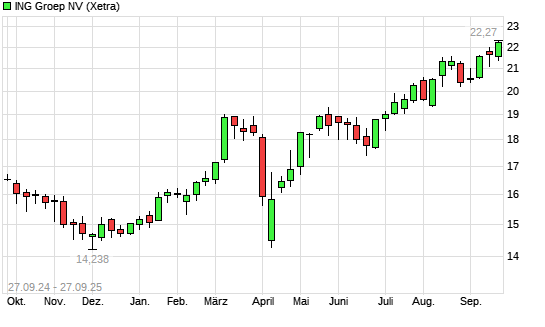 Mit dem Anstieg auf 22,18 EUR hat die ING Groep-Aktie (ISIN NL0011821202) am 26.09.2025 ein neues 10-Jahres-Hoch erreicht und damit den Kurs vom 15.09.2025 eingestellt.