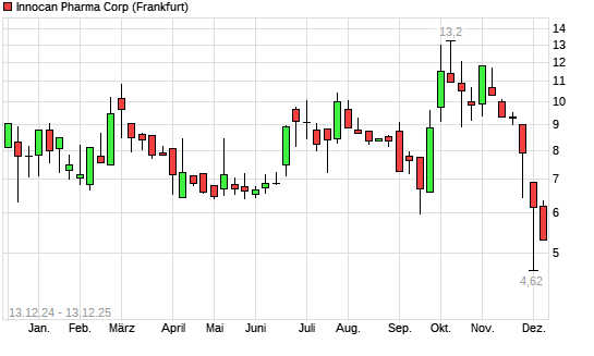 Mit dem Rücksetzer auf 5,30 EUR hat die INNOCAN PHARMA-Aktie (ISIN CA45783P5085) am 12.12.2025 ein neues 5-Jahres-Tief erreicht und damit den Kurs vom 10.12.2025 eingestellt.