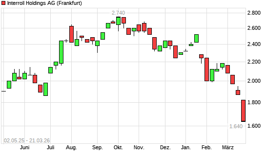 Mit dem Rücksetzer auf 1.640,00 EUR hat die INTERROLL HOLDINGS S-Aktie (ISIN CH0006372897) am 20.03.2026 ein neues 5-Jahres-Tief erreicht und damit den Kurs vom 19.03.2026 eingestellt.