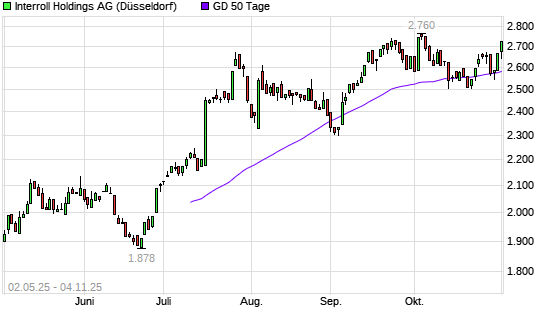 Mit dem Anstieg auf 2.660,00 EUR hat die INTERROLL HOLDINGS S-Aktie am 03.11.2025 die 50-Tage-Linie nach oben gekreuzt.