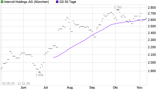Mit dem Anstieg auf 2.600,00 EUR hat die INTERROLL HOLDINGS S-Aktie am 10.11.2025 die 50-Tage-Linie nach oben gekreuzt.