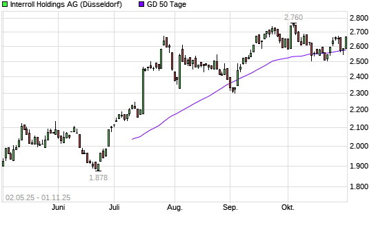 Mit dem Rücksetzer auf 2.560,00 EUR hat die INTERROLL HOLDINGS S-Aktie am 31.10.2025 die 50-Tage-Linie nach unten gekreuzt.