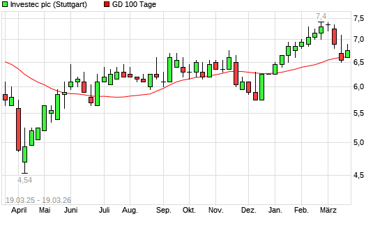 Mit dem Anstieg auf 7,05 EUR hat die INVESTEC-Aktie am 18.03.2026 die 100-Tage-Linie nach oben gekreuzt.