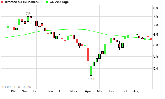 Mit dem Rücksetzer auf 6,15 EUR hat die INVESTEC-Aktie am 03.09.2025 die 200-Tage-Linie nach unten gekreuzt.