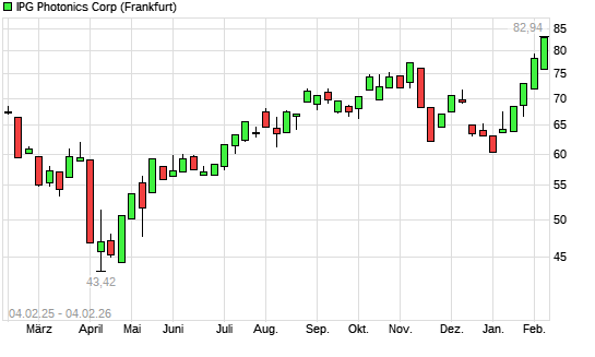 Mit dem Anstieg auf 79,74 EUR hat die IPG Photonics-Aktie (ISIN US44980X1090) am 03.02.2026 ein neues 12-Monats-Hoch erreicht und damit den Kurs vom 30.01.2026 eingestellt.