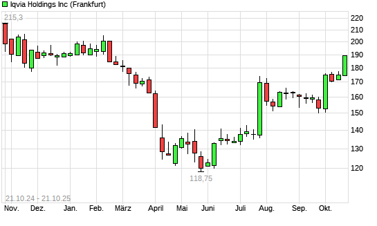 Mit dem Anstieg auf 181,95 EUR hat die IQVIA Holding-Aktie (ISIN US46266C1053) am 20.10.2025 ein neues 6-Monats-Hoch erreicht und damit den Kurs vom 14.10.2025 eingestellt.