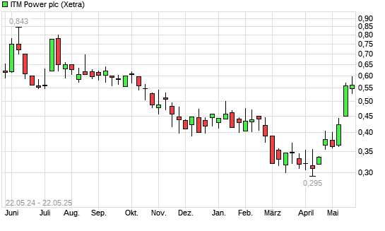 Mit dem Anstieg auf 0,58 EUR hat die ITM Power-Aktie (ISIN GB00B0130H42) am 21.05.2025 ein neues 6-Monats-Hoch erreicht und damit den Kurs vom 15.05.2025 eingestellt.