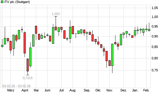 Mit dem Anstieg auf 0,97 EUR hat die ITV-Aktie (ISIN GB0033986497) am 02.02.2026 ein neues 6-Monats-Hoch erreicht und damit den Kurs vom 11.08.2025 eingestellt.