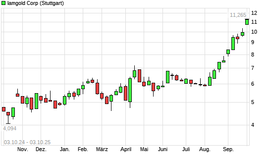 Mit dem Anstieg auf 11,31 EUR hat die Iamgold-Aktie (ISIN CA4509131088) am 02.10.2025 ein neues 10-Jahres-Hoch erreicht und damit den Kurs vom 30.09.2025 eingestellt.