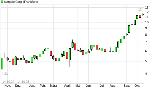 Mit dem Anstieg auf 11,77 EUR hat die Iamgold-Aktie (ISIN CA4509131088) am 13.10.2025 ein neues 10-Jahres-Hoch erreicht und damit den Kurs vom 06.10.2025 eingestellt.