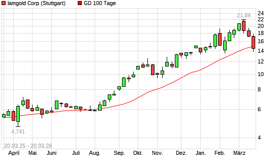 Mit dem Rücksetzer auf 14,43 EUR hat die Iamgold-Aktie am 19.03.2026 die 100-Tage-Linie nach unten gekreuzt.