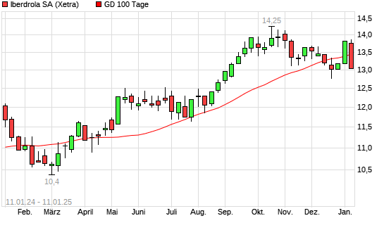 Mit dem Rücksetzer auf 13,19 EUR hat die Iberdrola-Aktie am 10.01.2025 die 100-Tage-Linie nach unten gekreuzt.