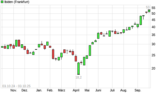 Mit dem Anstieg auf 52,50 EUR hat die Ibiden-Aktie (ISIN JP3148800000) am 02.10.2025 ein neues 12-Monats-Hoch erreicht und damit den Kurs vom 22.09.2025 eingestellt.