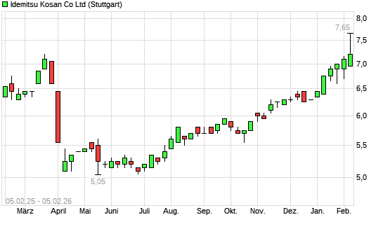 Mit dem Anstieg auf 7,50 EUR hat die Idemitsu Kosan-Aktie (ISIN JP3142500002) am 04.02.2026 ein neues 5-Jahres-Hoch erreicht und damit den Kurs vom 20.03.2025 eingestellt.