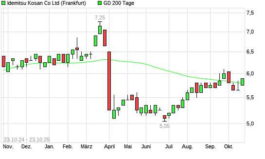Mit dem Anstieg auf 5,80 EUR hat die Idemitsu Kosan-Aktie am 22.10.2025 die 200-Tage-Linie nach oben gekreuzt.