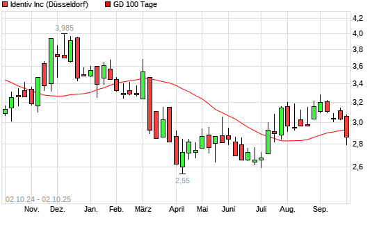 Mit dem Rücksetzer auf 2,86 EUR hat die Identiv-Aktie am 01.10.2025 die 100-Tage-Linie nach unten gekreuzt.