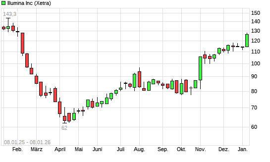 Mit dem Anstieg auf 129,00 EUR hat die Illumina-Aktie (ISIN US4523271090) am 07.01.2026 ein neues 6-Monats-Hoch erreicht und damit den Kurs vom 06.01.2026 eingestellt.
