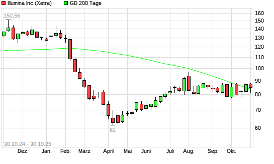 Mit dem Rücksetzer auf 81,63 EUR hat die Illumina-Aktie am 29.10.2025 die 200-Tage-Linie nach unten gekreuzt.