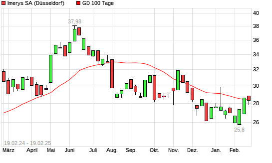 Mit dem Rücksetzer auf 28,28 EUR hat die Imerys-Aktie am 18.02.2025 die 100-Tage-Linie nach unten gekreuzt.