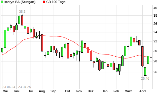 Mit dem Rücksetzer auf 28,74 EUR hat die Imerys-Aktie am 22.04.2025 die 100-Tage-Linie nach unten gekreuzt.