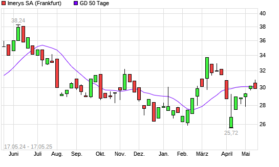 Mit dem Rücksetzer auf 29,90 EUR hat die Imerys-Aktie am 16.05.2025 die 50-Tage-Linie nach unten gekreuzt.